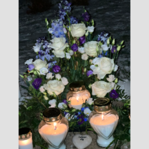 9/12, din dag för urnsättning. Jag ville göra din urnkrans själv med vita rosor & blålila blommor. En hemsk, svart, overklig stund. Jag satt vid kanten & ville inte släppa dig. Ytterligare en bit dog inom mig.